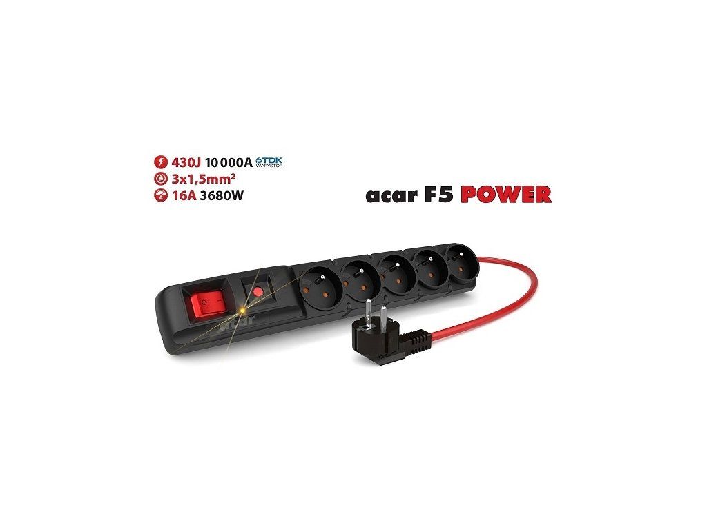 Acar F5 3m kabel, 5 zásuvek, přepěťová ochrana, max.proud 16A, černý
