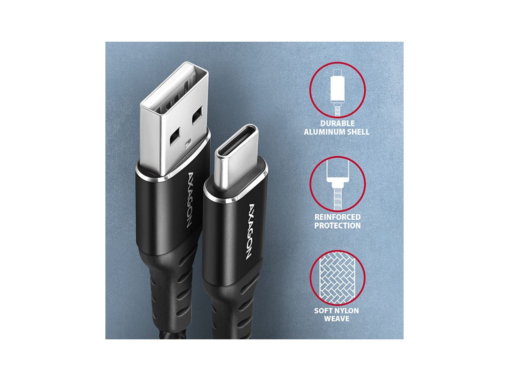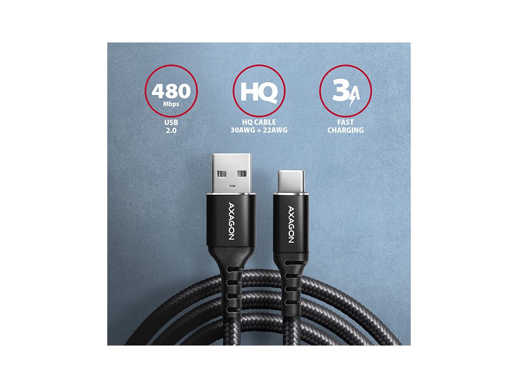 Prémiový propojovací USB-C <-> USB-A datový a nabíjecí AXAGON BUCM-AM20AB HQ USB 2.0 kabel s konektory USB-C male a USB-A male. Kabel je navržen pro synchronizaci dat a nabíjení telefonů, tabletů a dalších mobilních zařízení. Podporuje přenos dat rychlostí až 480 Mb/s a nabíjení proudem až 3A. Kabel je kompatibilní s nabíjecími technologiemi Quick Charge, Samsung AFC, Huawei FCP, SMART a dalšími.