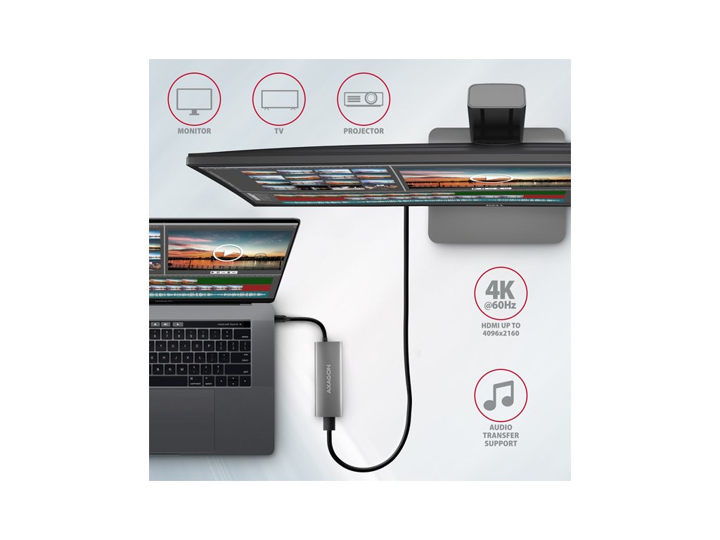HDMI výstup poskytuje kvalitní obraz až do rozlišení 4K/60Hz Ultra HD a podporuje přenos vícekanálového zvuku. Podporovány jsou také vysoké frekvence v oblíbených hráčských rozlišeních 2K/120Hz nebo FullHD/120Hz. Díky podpoře HDR (vysoký dynamický rozsah) si můžete bez omezení vychutnat výrazně rozšířený rozsah barev a kontrastů. Pro správné fungování video výstupu je nutné, aby notebook měl USB-C port s podporou DisplayPort Alternate Mode (DP Alt Mode) nebo port Thunderbolt 3, 4 a výše.