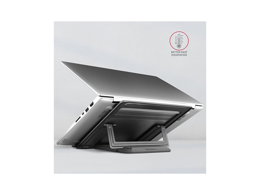 Stojan lze snadno složit do kompaktních rozměrů, což umožňuje pohodlné přenášení kamkoli potřebujete. Jeho elegantní design v šedé barvě nejen stylově doplní váš pracovní stůl, ale také přináší praktické funkce, které oceníte při každodenním používání.