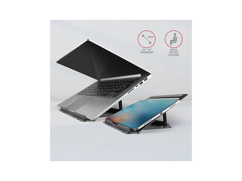 AXAGON STND-L je skládací stojan na notebook či tablet, který zajišťuje pohodlí a zlepšuje ergonomii při práci. Je ideální pro zařízení s úhlopříčkou od 10" do 17.3" a umožňuje nastavení až čtyř poloh. Snadno tak najdete ideální sklon stojanu pro maximální uvolnění vašich krčních a zádových svalů. Užijte si komfortní pracovní prostředí s kompaktním a přenosným stojanem, který se dokonale přizpůsobí vašim potřebám, ať už pracujete doma, v kanceláři, nebo na cestách.