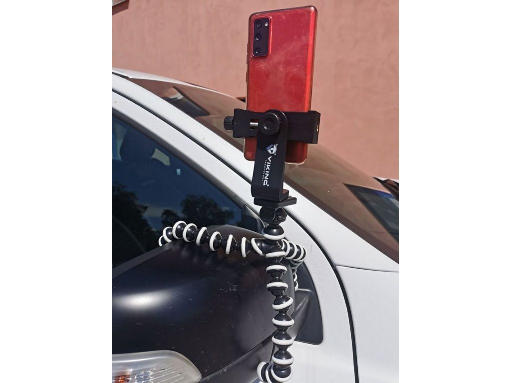 2) Držák pro uchycení mobilního telefonu, kamery nebo fotoaparátu, je také nastavitelný ve všech směrech. Výhodou tohoto speciálního držáku je možnost rozdělení držáku na dva samostatné držáky, a tím dle potřeby měnit nastavení uchycení kamery nebo telefonu, pro ještě lepší úhly a záběry.