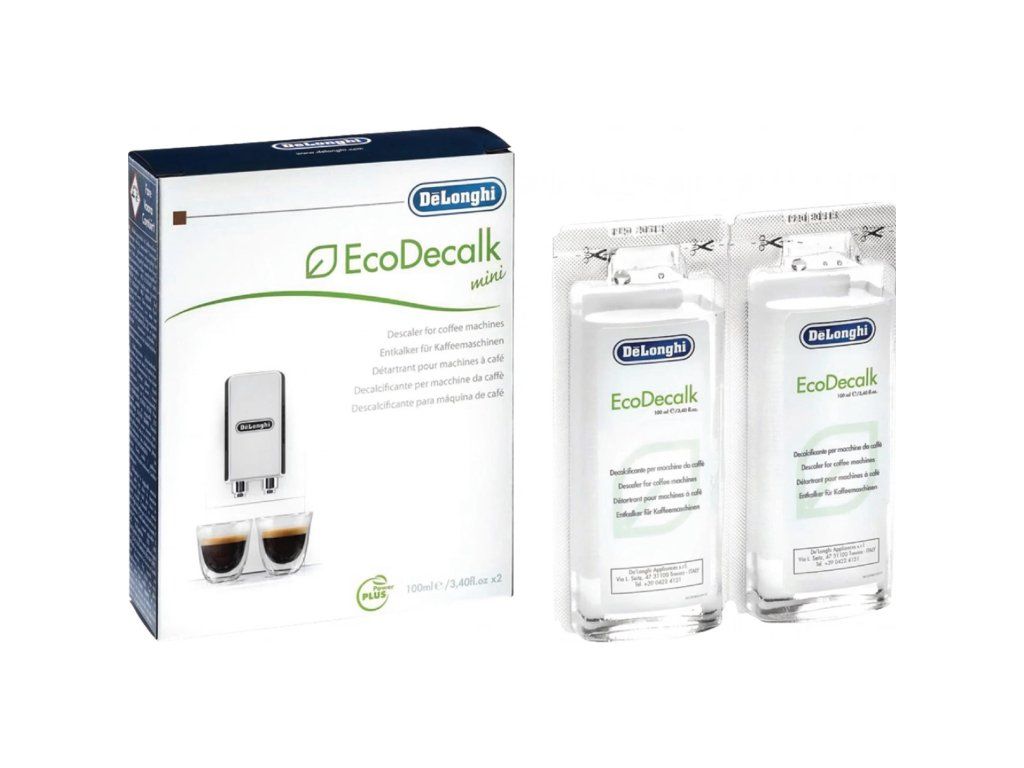 EcoDecalk je nový odvápňovací prostředek De'Longhi. Jeho složení je navrženo tak, aby byl 100% ekologicky nezávadný a zároveň ještě účinnější v boji proti vodnímu kameni uvnitř kávovarů než klasické odvápňovače.