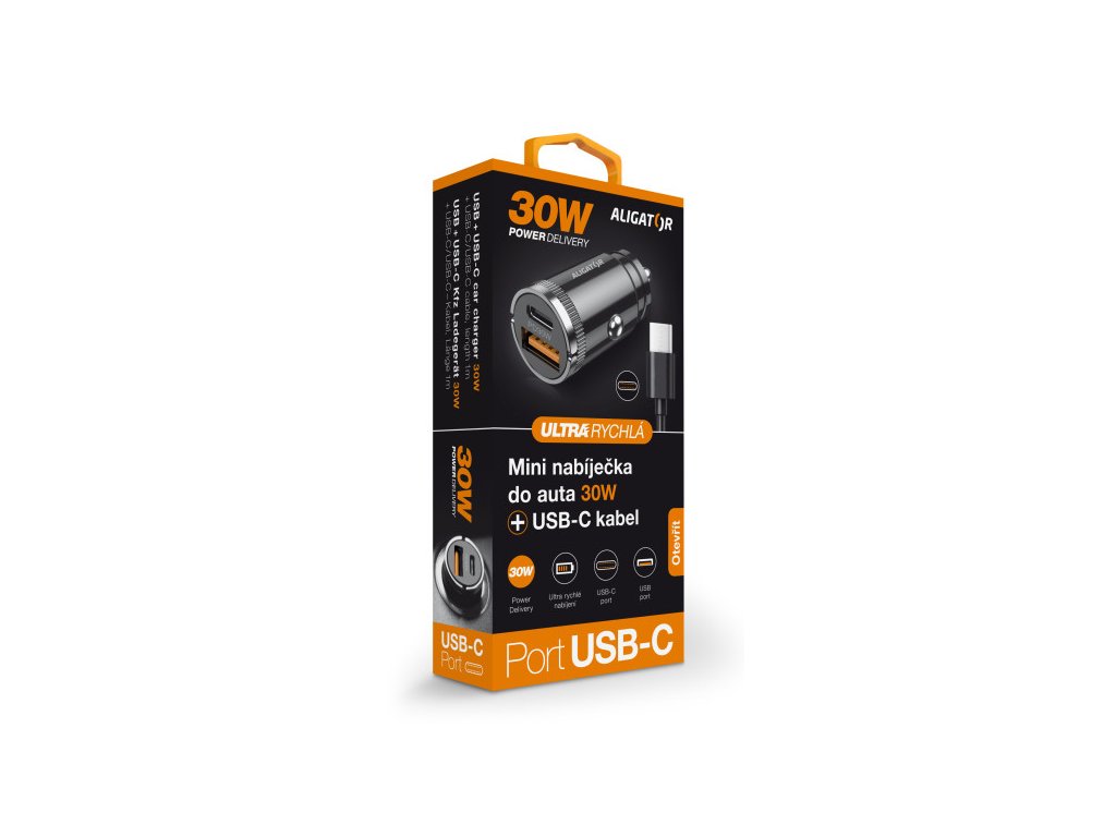 Aligator mini nabíječka do auta Power Delivery 30W, USB-C + USB-A, USB-C/USB-C kabel