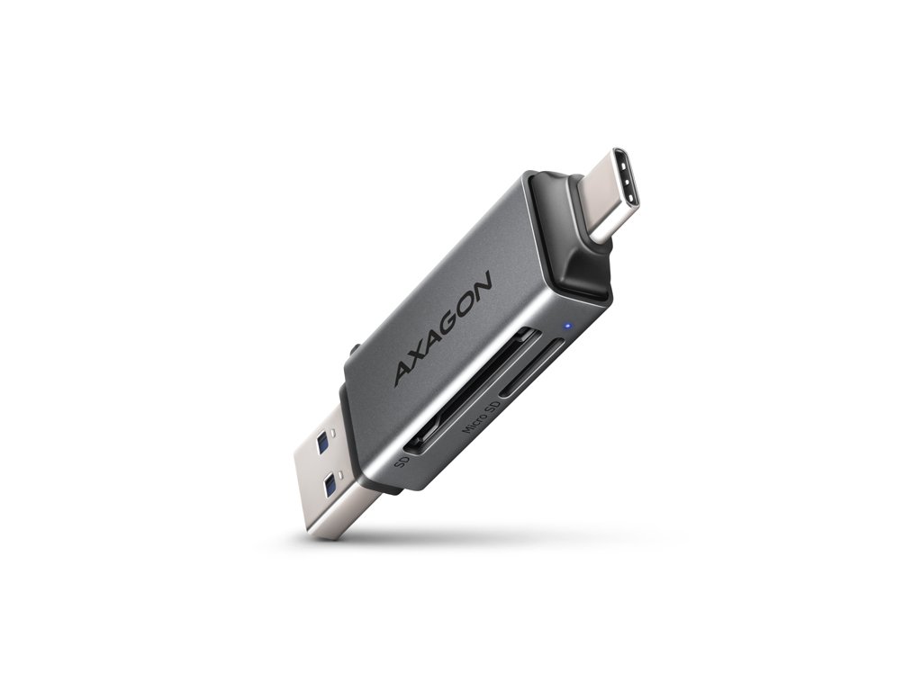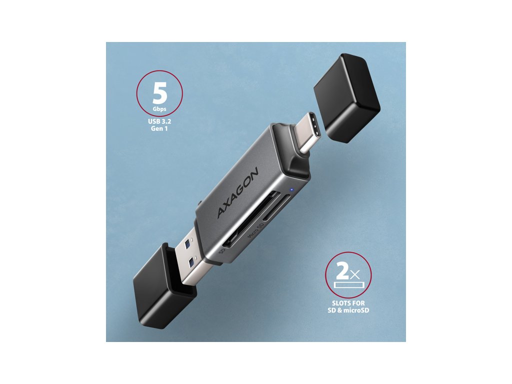 AXAGON CRE-DAC, USB-C + USB-A, 5 Gbps - MINI čtečka karet, 2-slot & lun SD/microSD, podpora UHS-I