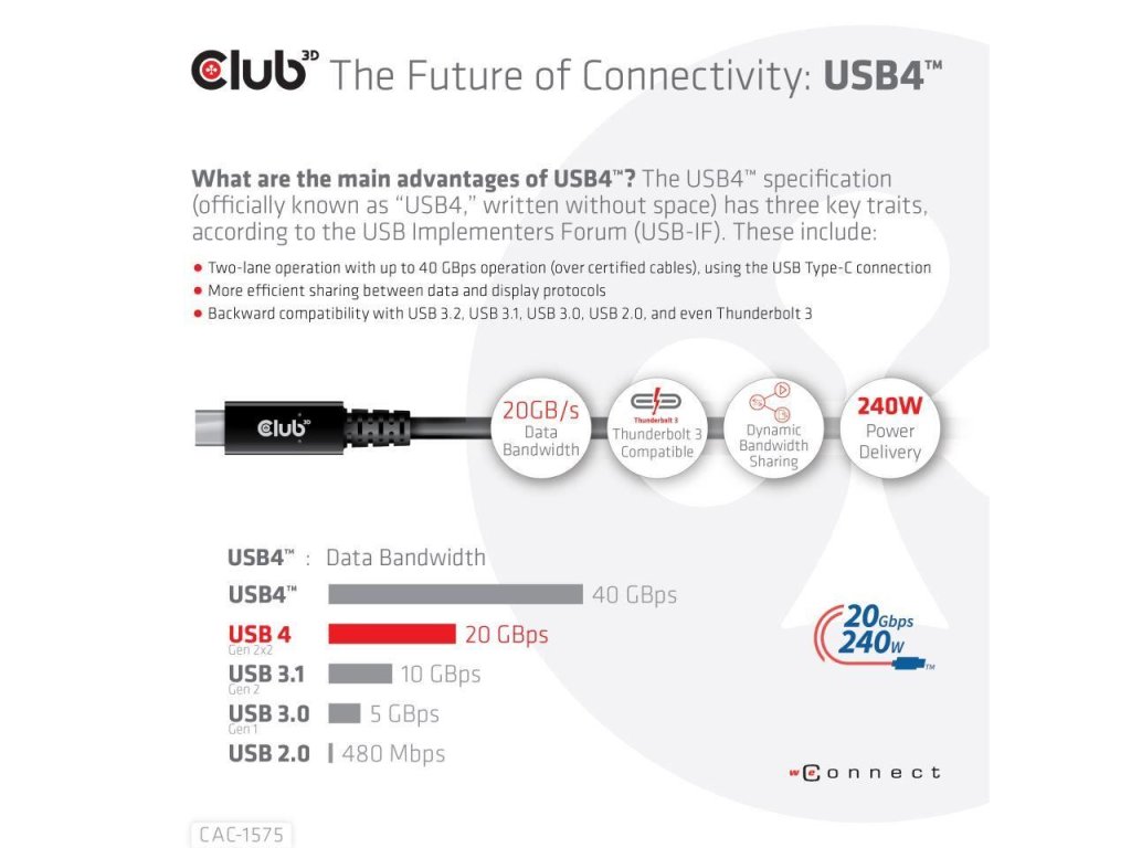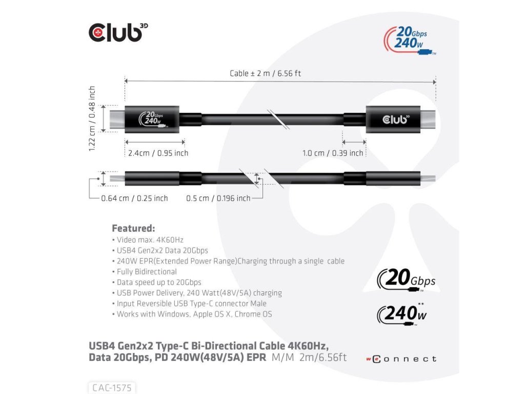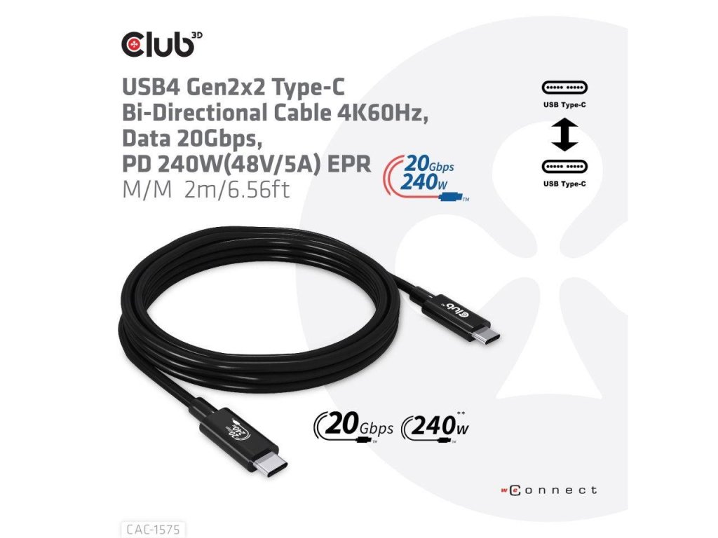 Club3D kabel USB4 Gen2x2 Typ-C, Oboustranný USB-IF Certifikovaný data kabel, Data 20Gbps, PD 240W(48V/5A) EPR M/M 2m
