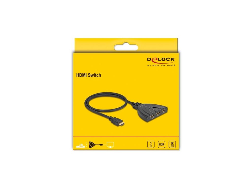 Delock HDMI Switch 3 x vstupní porty HDMI na 1 x výstupní port HDMI, 8K 60 Hz s integrovaným kabelem 60 cm