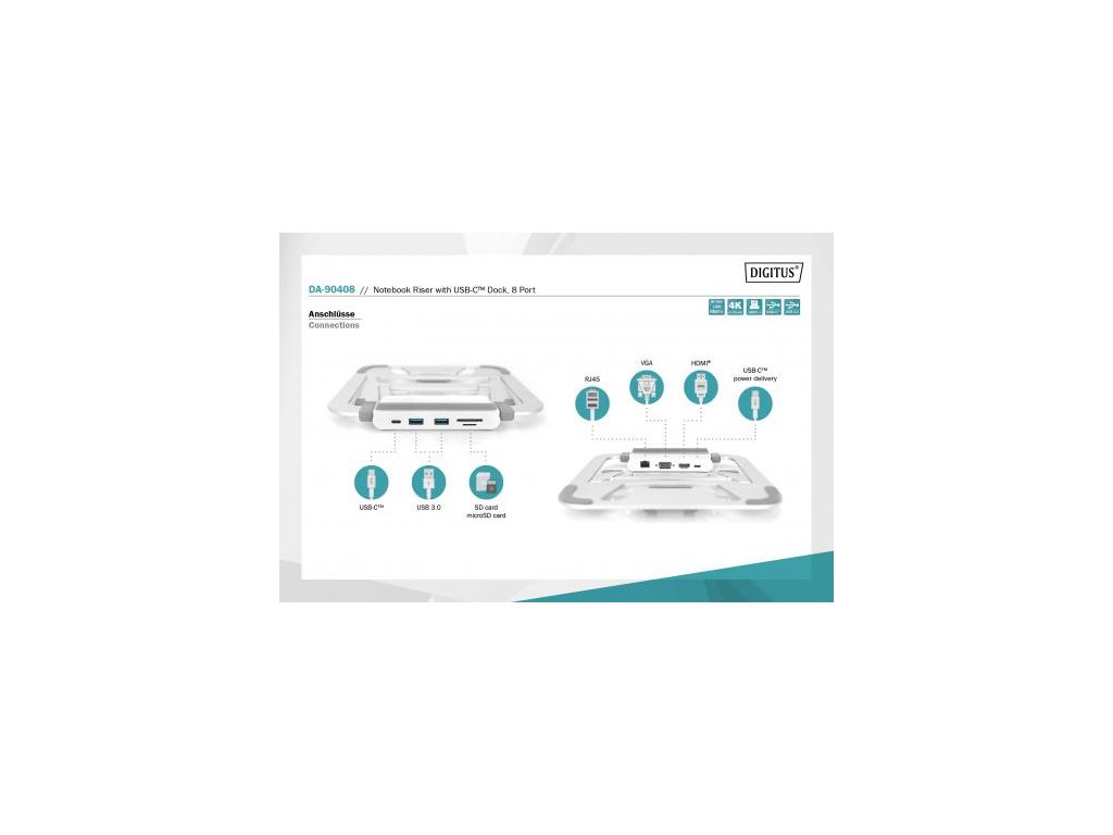 DIGITUS variabilní stojan na notebook s integrovanou dokovací stanicí USB-C ™, 8 portů