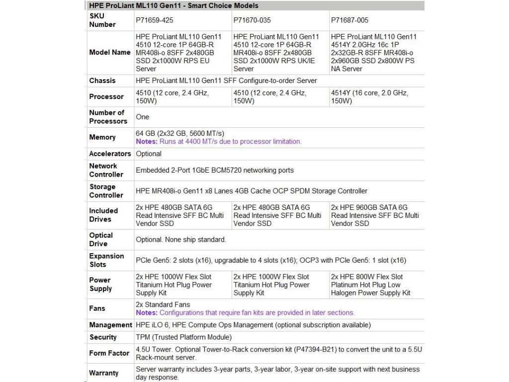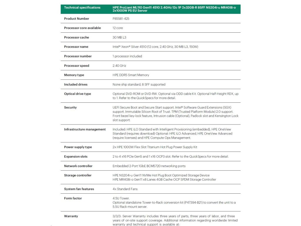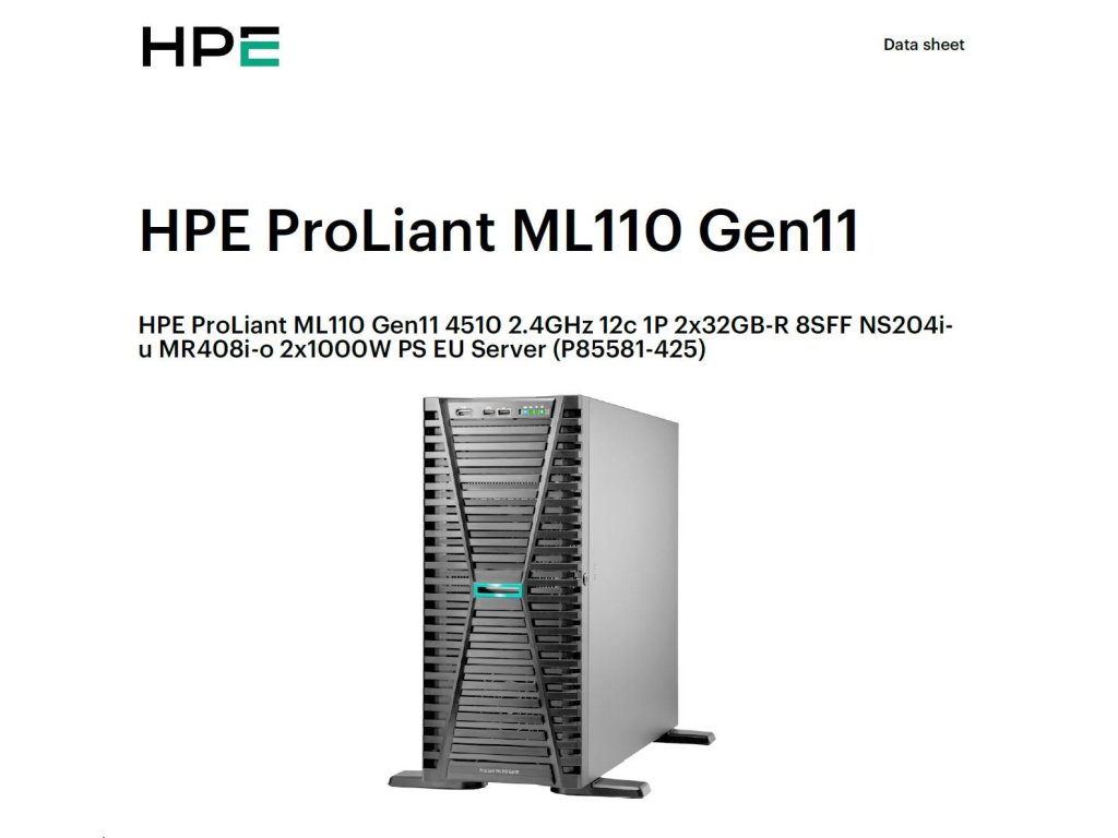 HPE PL ML110g11 4510 (2.4G/12C) NS204(2x480) 2x32G (P64706) MR408i-o 2x1000W 8SFF 2x1G NBD333 Smart Choice