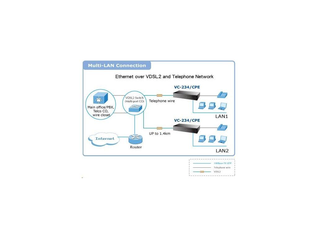 Planet VC-234, Eth. VDSL2 konvertor, 100Mbit, master/slave, 2x RJ-11, splitter, 4x RJ-45