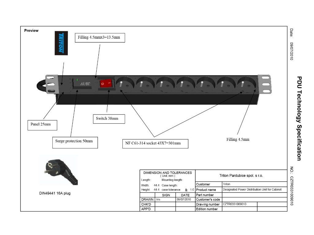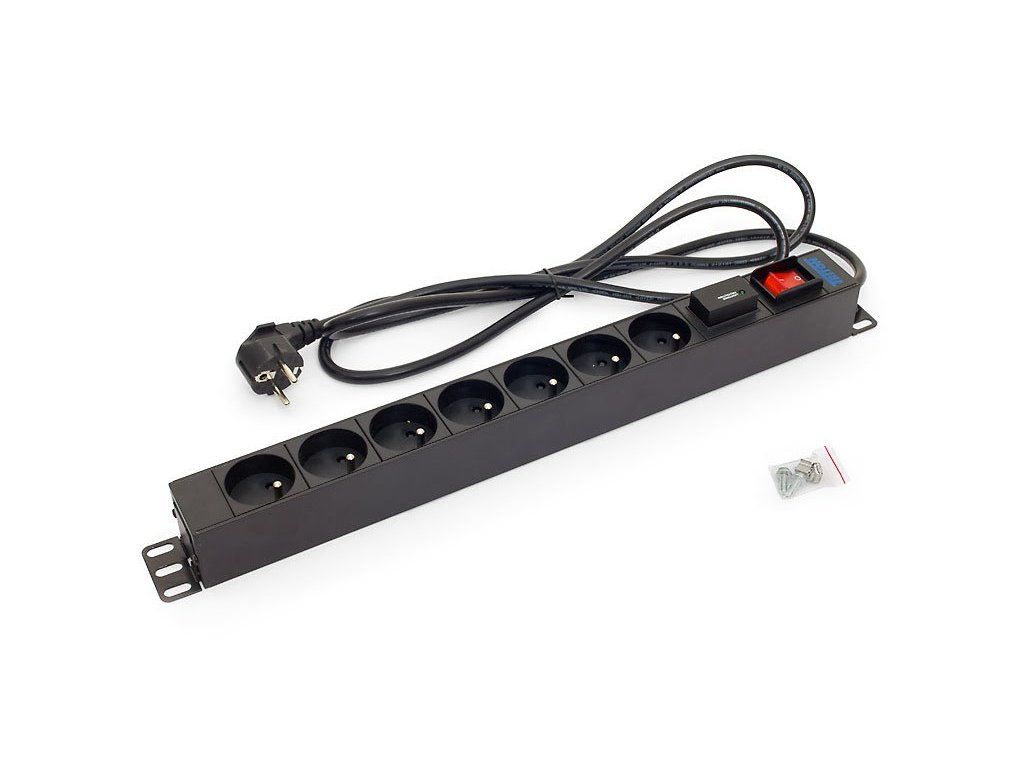 Rozvodný panel Triton 19“ 1U; 7 x zásuvka podle ČSN, max. 16 A; kabel 3 x 1,5 mm, 2 m + zástrčka univerzál CZ-DE max. 16