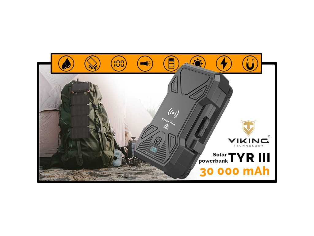 Solární powerbanka VIKING TYR III/Output:1xUSB-C,2xUSB-A/Wireless charge 15W max/30000mAh/LED světlo