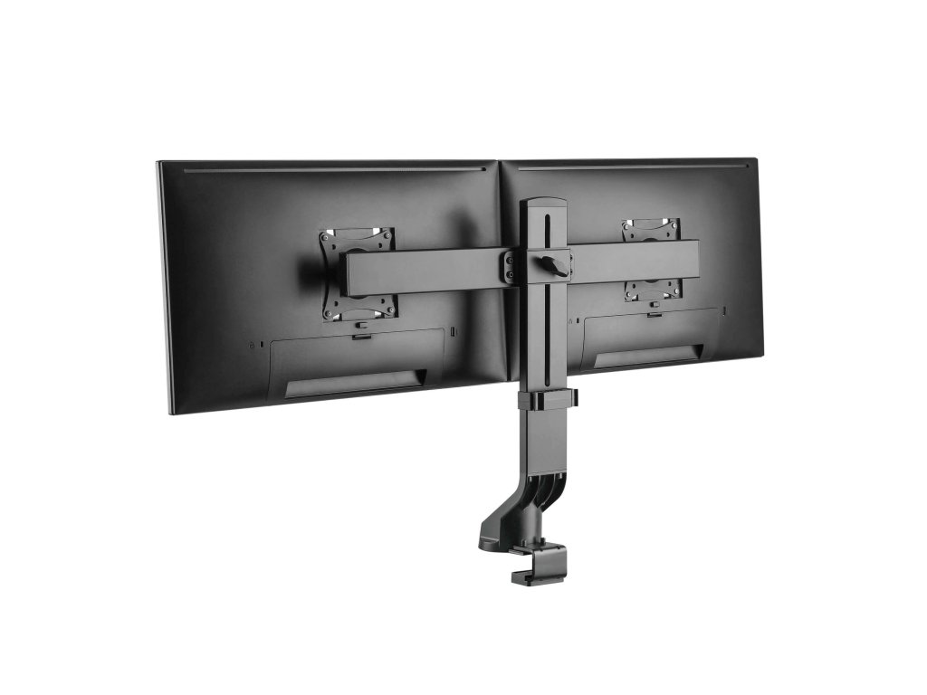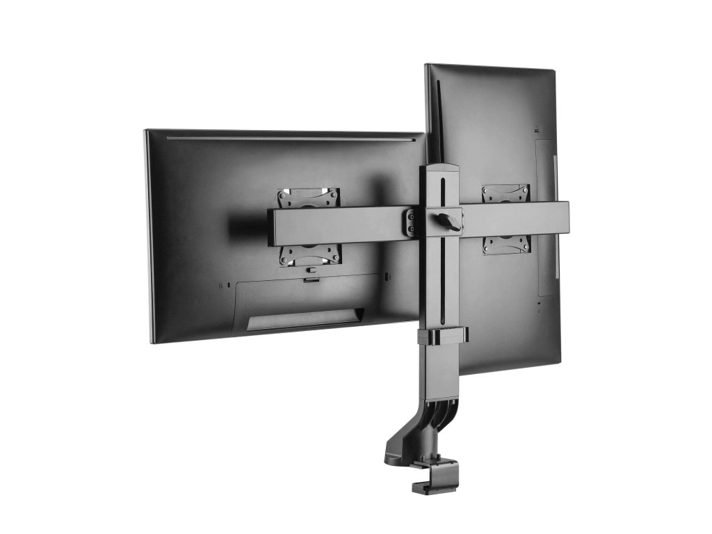 - Připevňuje 2 monitory k vašemu pracovnímu prostoru pomocí svorky nebo průchodky a umožňuje vertikální nastavení jedním dotykem pomocí snadno uchopitelného knoflíku