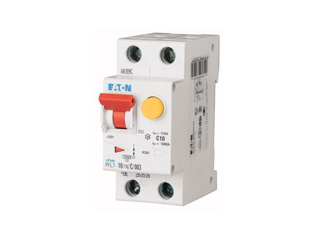 Chránič s nadproudovou ochranou PFL7, 1 pól + N, Jmenovitý pracovní proud In: 10 A, Jmenovitý reziduální proud IΔN: 0,03 A, Jmenovitá spínací schopnost podle ČSN EN 61009: 10 kA, Spínací přístroje pro bytovou výstavbu a účelové stavbyKód produktu: 10.060.655