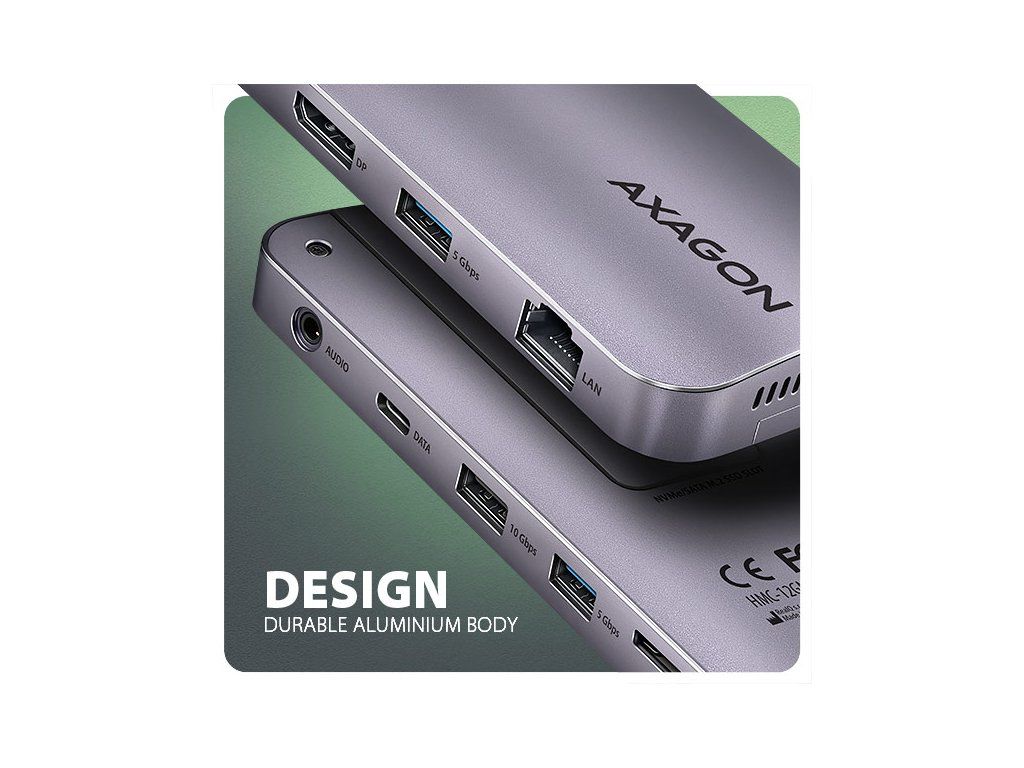 AXAGON HMC-12GM2, USB 10Gbps hub, 3x USB-A, USB-C, HDMI, DP, RJ-45 GLAN, M.2, SD/mSD, audio, PD