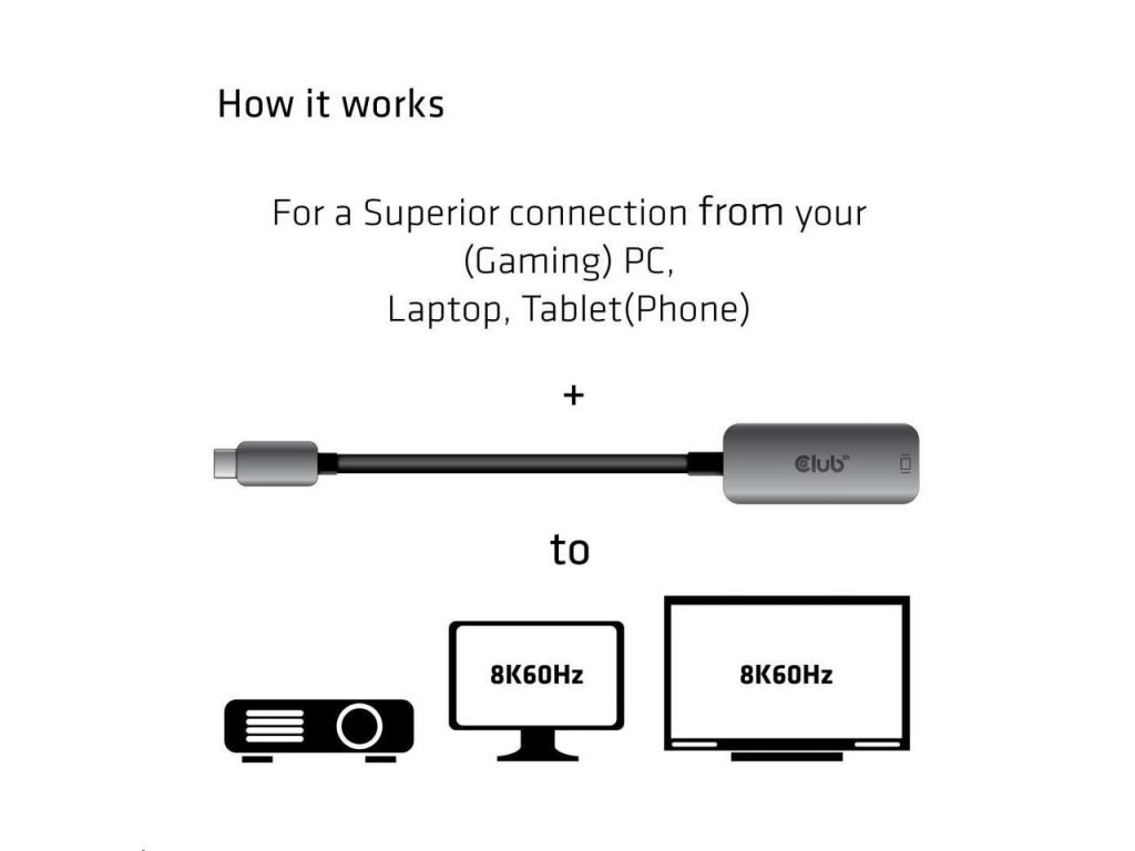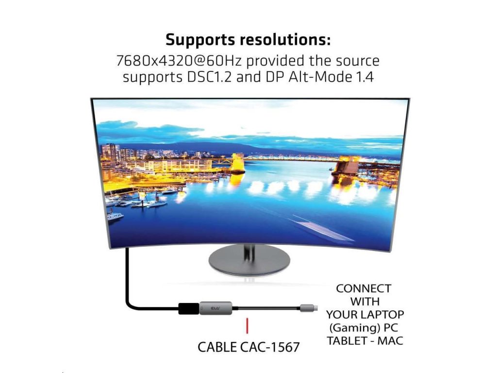 CAC-1567 - Club 3D USB typu C na DisplayPort™ 1.4 Adaptér 8K60Hz za predpokladu, že zdroj podporuje DSC1.2 HBR3 umožňuje pripojiť akýkoľvek zdroj USB typu C k displeju DisplayPort™ s maximálnym rozlíšením 8K60 Hz a podporou HDR.