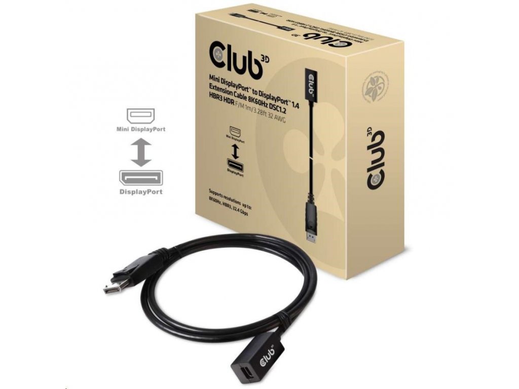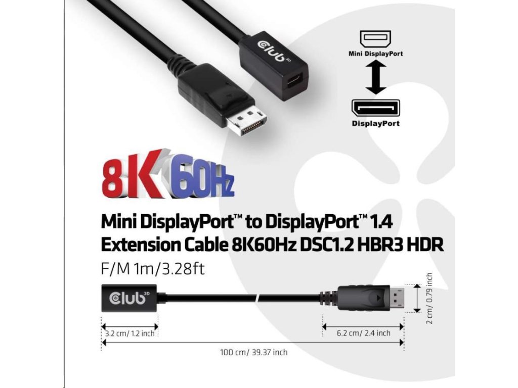 Club3D Prodlužovací kabel Mini DisplayPort 1.4 na DisplayPort 8K 60Hz DSC 1.2 HBR3 HDR Bidirectional (F/M), 1m