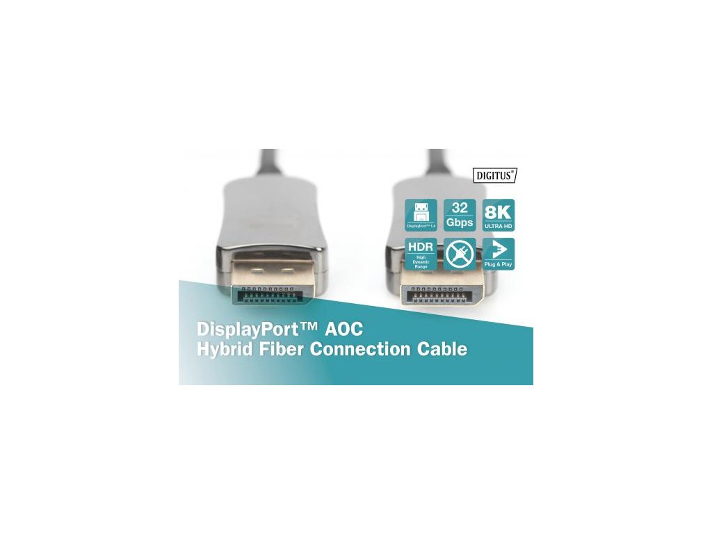 Digitus DisplayPort AOC hybridní připojovací kabel M/M, 15m, UHD 8K@60Hz, CE, zlato, bl