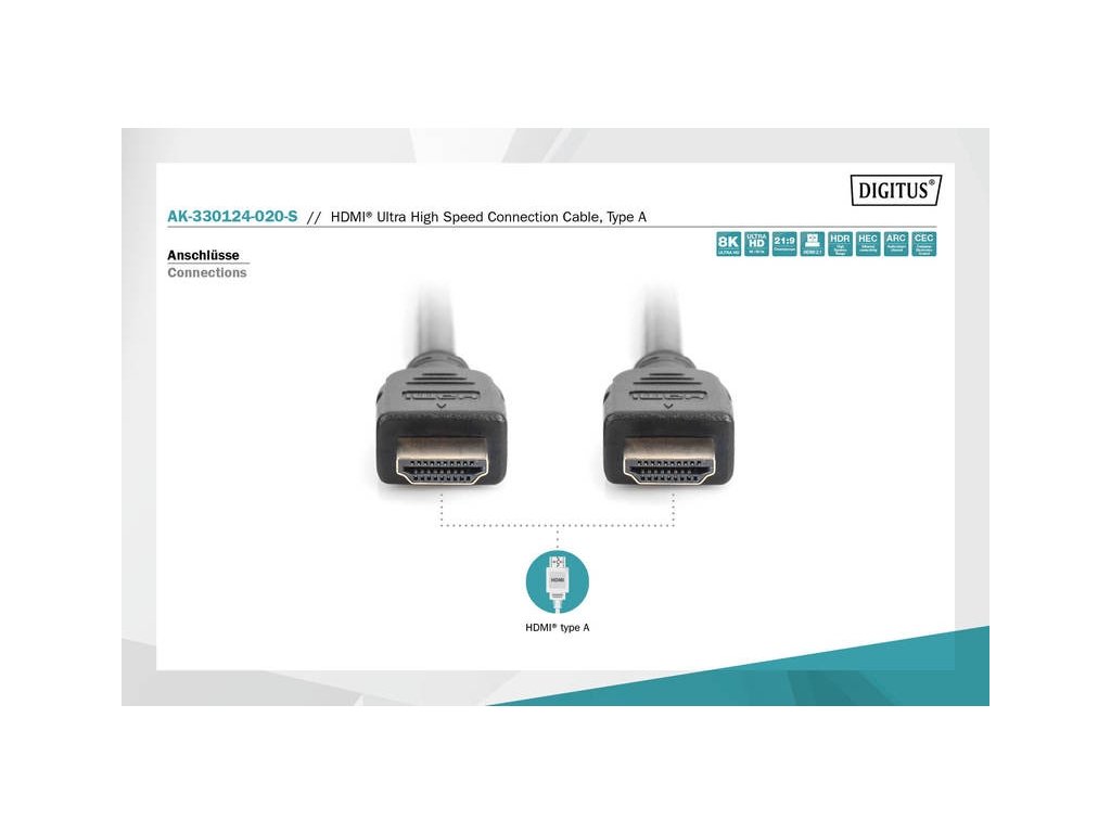 Digitus připojovací kabel HDMI 2.1 Ultra High Speed, typ A M / M, 2,0 m, s Ethernetem, UHD 8K 60p, zlacené konektory