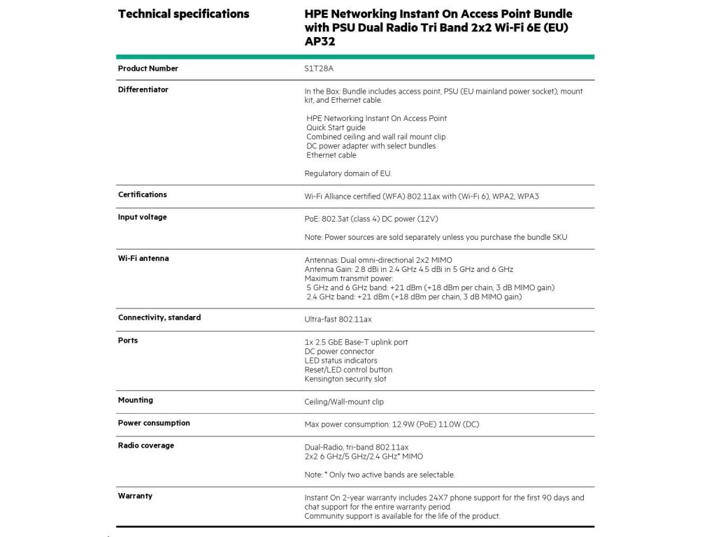 HPE Networking Instant On Access Point Bundle with PSU Dual Radio Tri Band 2x2 Wi-Fi 6E (EU) AP32 ( S1T28A )