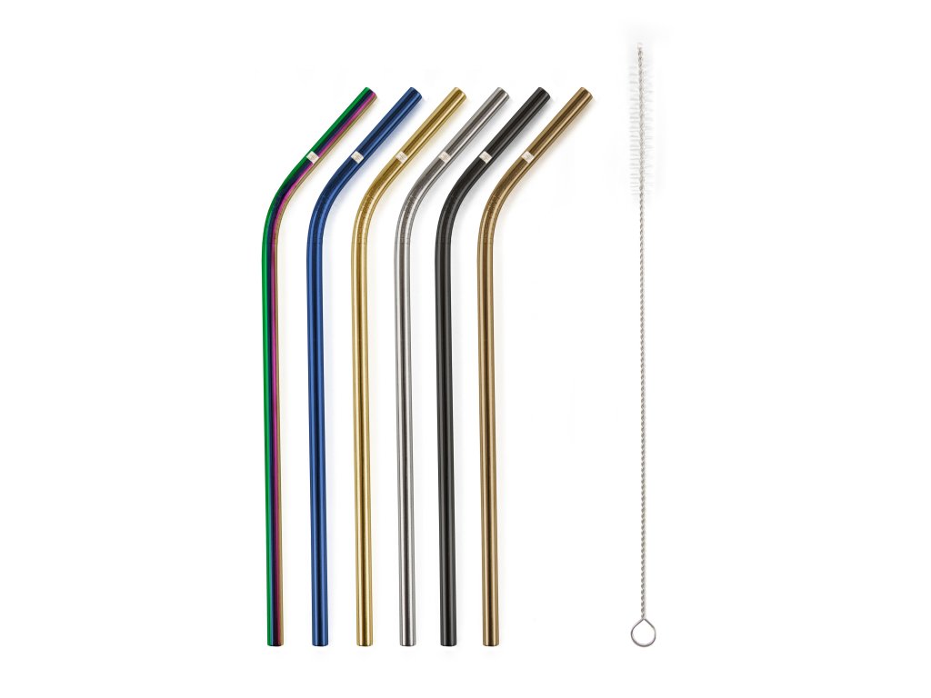 Kovová brčka G21 BeEco Party 6 ks mix barev, zahnutá + kartáček na čištění