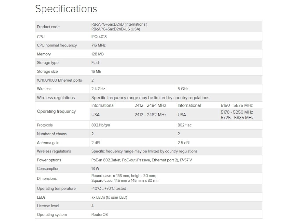 RBcAPGi-5acD2nD / cAP ac (stropní Access Point) je stropní dual band AP od MikroTiku s modulačními rychlostmi 300 Mbps (2.4GHz) a 866Mbps (5GHz). Navrženo bylo tak, aby maximálně splynulo s místem instalace, ideální pro hostinské činnosti, jako restaurace, hotely, letiště, nákupní centra, atd... cAP ac podporuje 802.11a/b/g/n/ac a může být napájeno pomocí pasivního PoE. Je to ideální zařízení pro MikroTik CAPsMAN (řízený správce AP systému), který umožňuje ovládat všechna AP zařízení z jednoho centrálního místa.