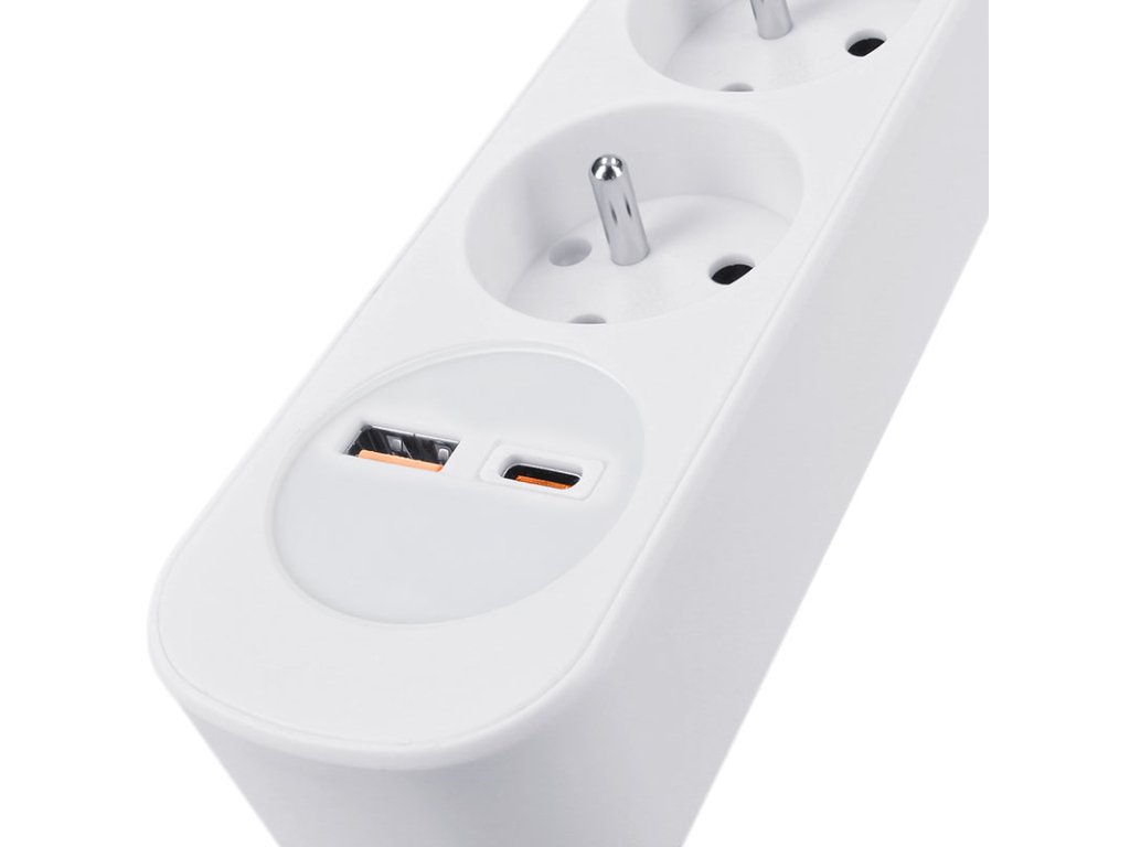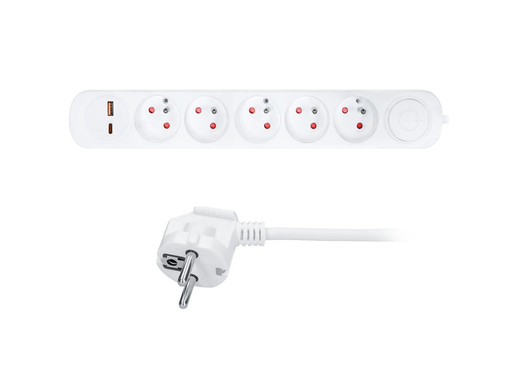 Solight prodlužovací přívod 5 zásuvek, USB A+C 20W PD, 3m, 3 x 1mm2, bílý, vypínač