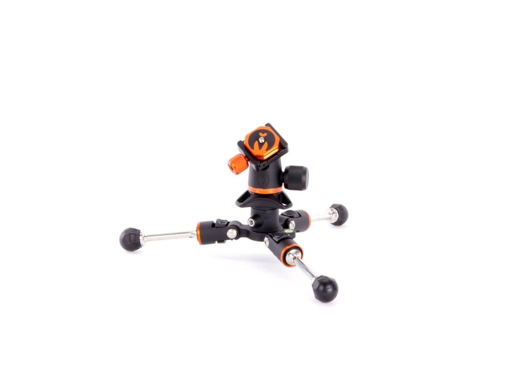 S plně vysunutelným středovým sloupcem prodloužíte tripod až do pracovní výšky 186 cm, přičemž si uchová schopnost sklopení dolů do minimální 10,6cm pracovní výšky či do skladné délky 42 cm. Stativová základna vám umožní rychlé a přesné nastavení roviny snímku při natáčení videa nebo fotografování na šířku. Tření základny je řízeno D-kroužkem na její spodní straně, který navíc umožní připevnění závaží k nohám pro zvýšení stability. Robustní tvarovaná deska obsahuje 3 duté ostrohy pro připojení popruhu, otvíráku, karabiny či nástroje 3LT Toolz, který je součástí dodávky.