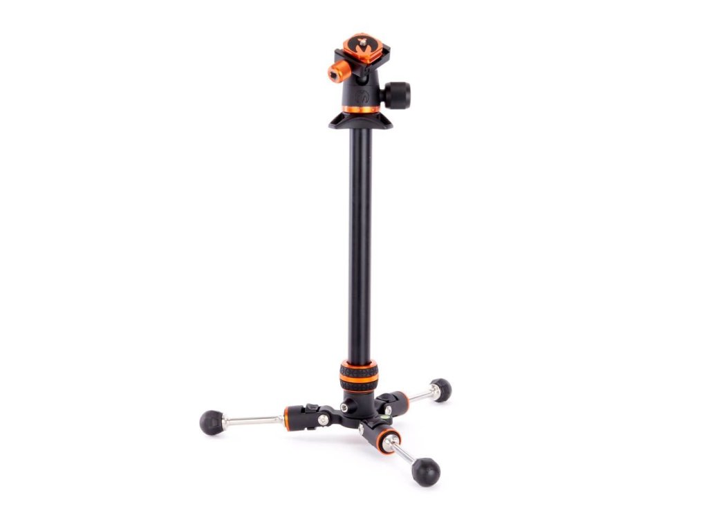 S plně vysunutelným středovým sloupcem prodloužíte tripod až do pracovní výšky 166 cm, přičemž si uchová schopnost sklopení dolů do minimální 11,8cm pracovní výšky či do skladné délky 45,7 cm. Stativová základna vám umožní rychlé a přesné nastavení roviny snímku při natáčení videa nebo fotografování na šířku. Tření základny je řízeno D-kroužkem na její spodní straně, který navíc umožní připevnění závaží k nohám pro zvýšení stability. Tvarovaná deska obsahuje 3 duté ostrohy pro připojení popruhu, otvíráku, karabiny či nástroje 3LT Toolz, který je součástí dodávky.