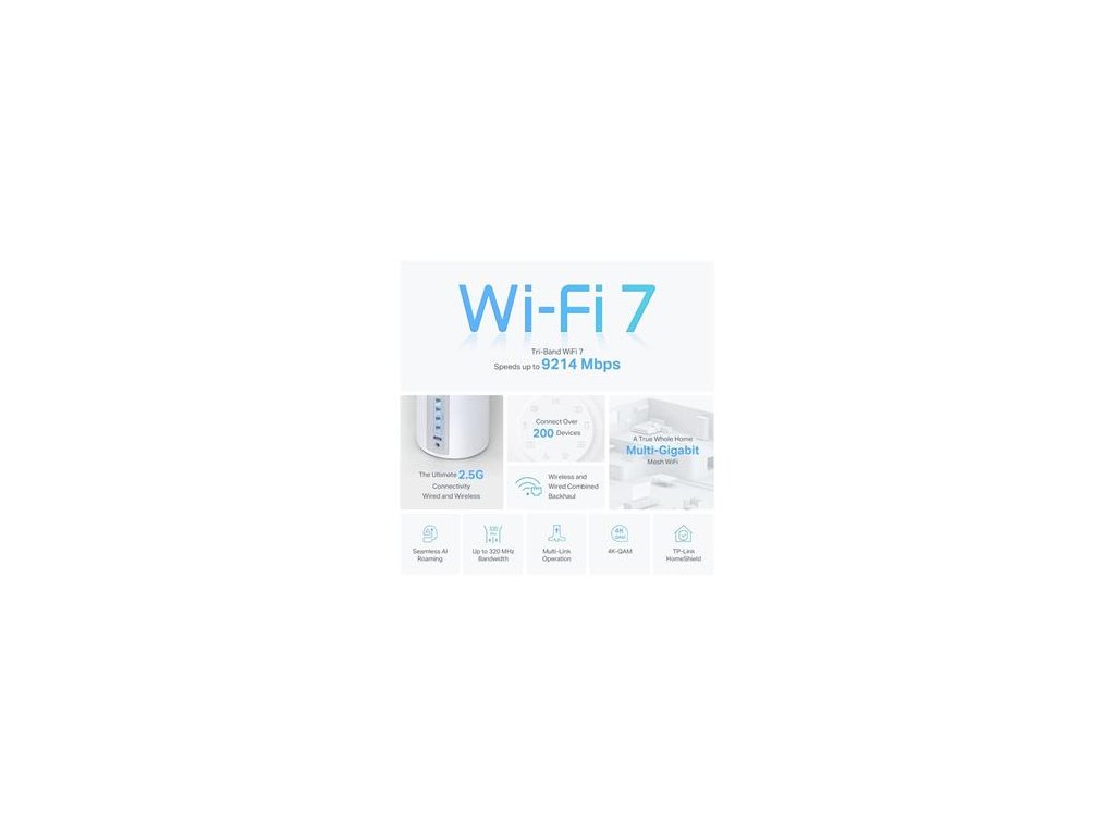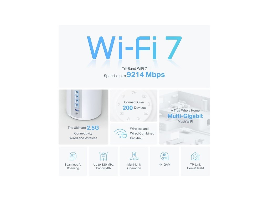 TP-Link Deco BE65(1-pack) BE9300 Třípásmový systém Mesh WiFi 7 pro celou domácnost, 4x 2.5GLAN, USB, 2,4/5/6GHz, HomeShi