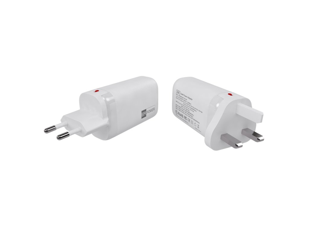 Cestovní GaN nabíječka s výkonem 65W a porty USB-C a USB-A. Součástí balení jsou vyměnitelné vidlice UK a EU. Nabíječka disponuje dvěma porty USB-C a portem USB-A. Vyměnitelné UK a EU vidlice, které v případě potřeby umístíte na US vidlici, která je v nabíječce integrována. Barva: bílá