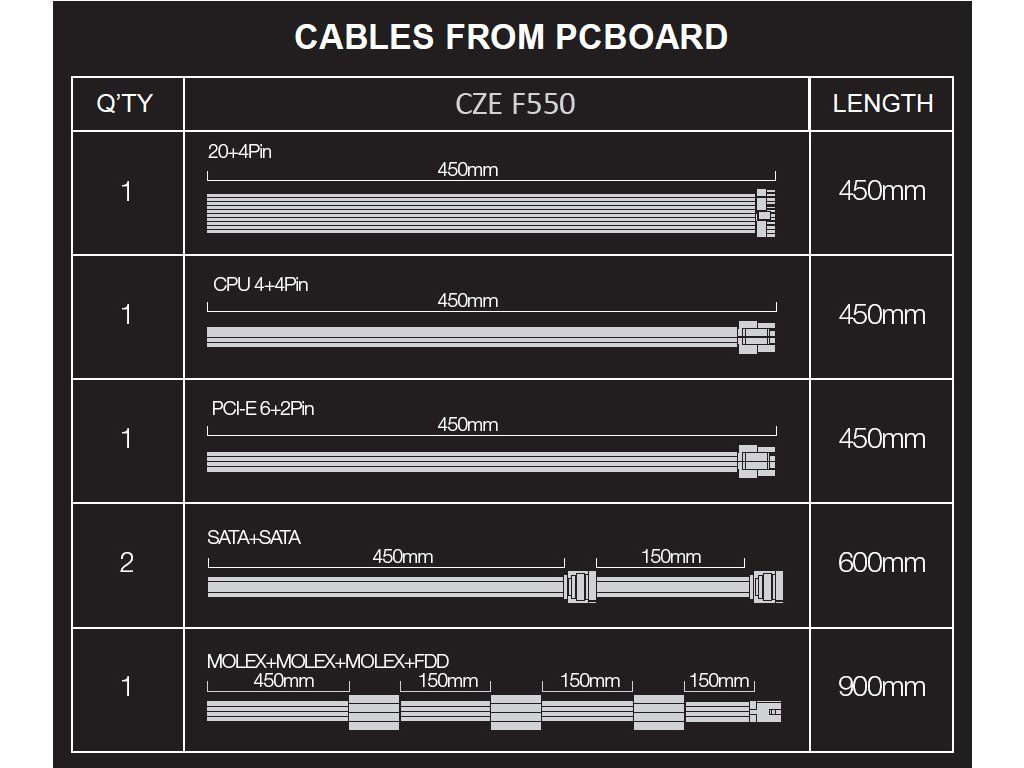 • 1x MOLEX, 450mm + MOLEX 150mm + MOLEX 150 mm + FDD 150 mm
