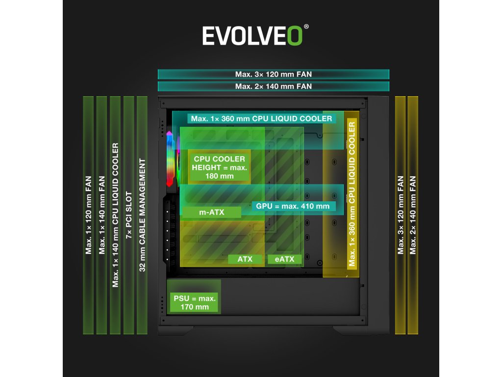 V počítačové skříni EVOLVEO Rhino-BK-4 je dostatek místa na všechno, co má nadupaná herní mašina mít. Vejde se sem až 415mm grafická karta, chladič procesoru o výšce až 180 mm i všechny potřebné disky – ve skříni jsou 4 pozice pro 3,5" HDD a 5 slotů pro 2,5" SSD. Nic vám tak nebrání sestavit si počítač, jehož hardware hraje první ligu.