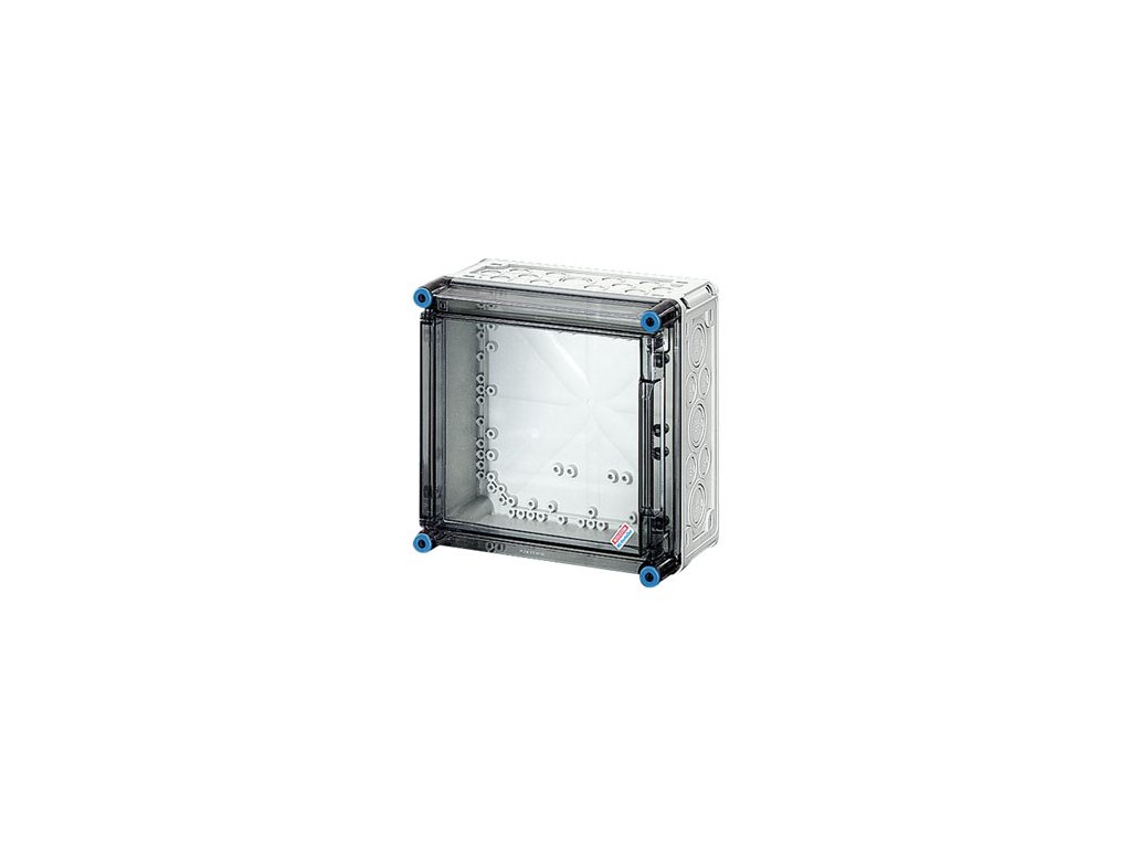 Skříně pro montáž kombinací energetických spínačů do 630 A nebo jako jednotlivé skříně. Z vysoce kvalitního polykarbonátu s ochrannou izolací. Stěnové průchodky s velkými otvory pro elektrické připojení skříní. Kabelové vstupy na všech stěnách skříní přes metrické předlisy nebo montážní příruby. Skříně pro upevnění na stěnu také pomocí vnějších patek nebo s montážními lištami. Prázdná skříň s průhledným víkem. Montážní rozměry š 275 mm x v 275 mm x h 119 mm. Pro montáž přístrojů na montážní desku nebo na nosnou lištu DIN. Max. vestavná hloubka při zabudované montážní desce 115 mm, při zabudované nosné liště 104 mm. Uzávěry víka otevíratelné pomocí nástroje.Kód produktu: 10.054.679