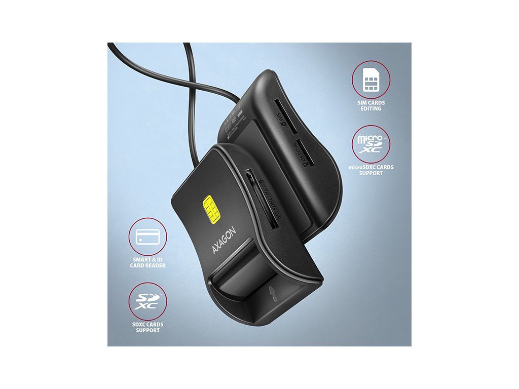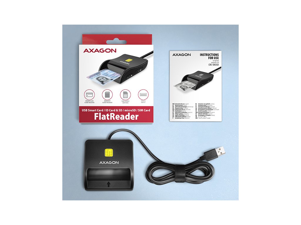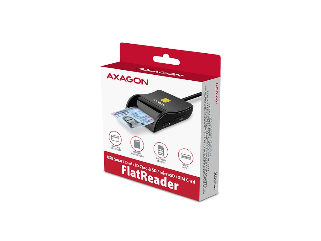 AXAGON CRE-SM3SD, USB-A FlatReader čtečka Smart card (eObčanka) + SD/microSD/SIM, kabel 1.3 m