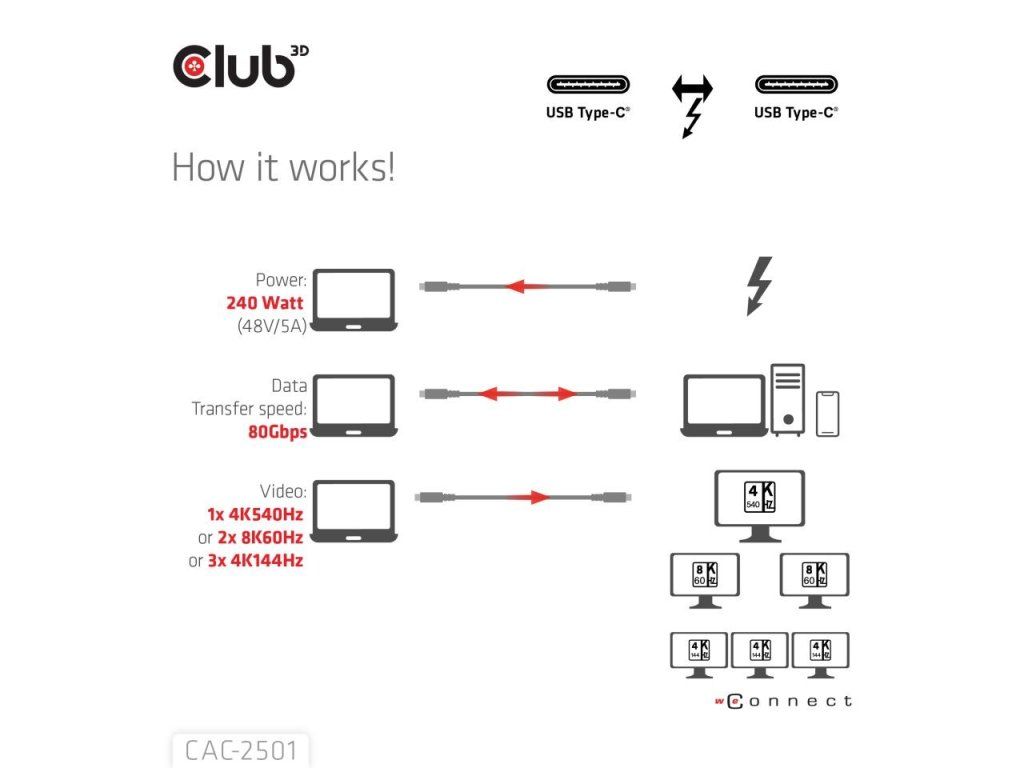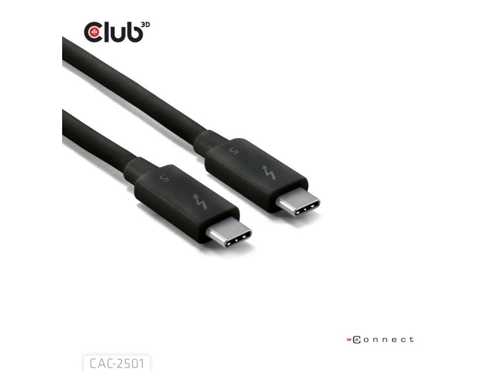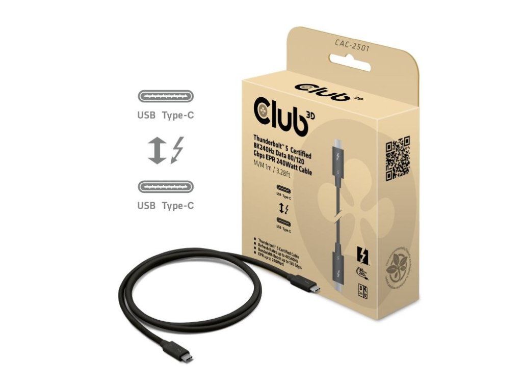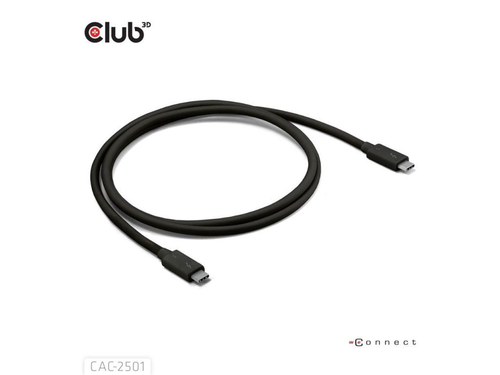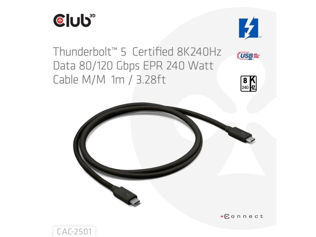 Club3D Kabel Thunderbolt 5, 80/120Gbps, Certifikovaný kabel, 1x 4K540Hz, 2x8K240Hz, PD 240W, 1m