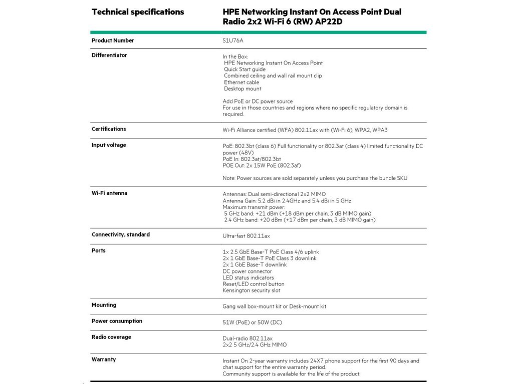 HPE Networking Instant On Access Point AP22D Dual Radio 2x2 Wi-Fi 6 (RW) (desktop or wallmount)