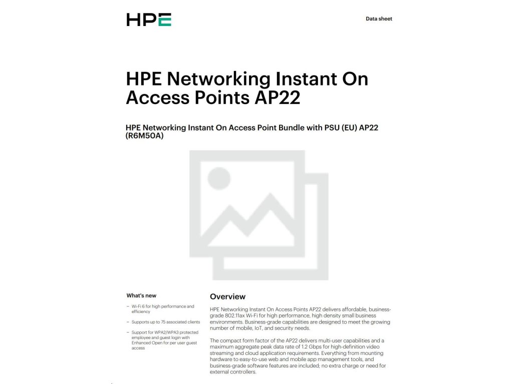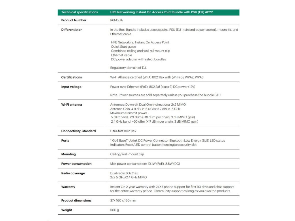 HPE Networking Instant On Access Point Bundle with PSU (EU) AP22 (Includes 12V Power Adapter with EU Power Plug) R6M50A