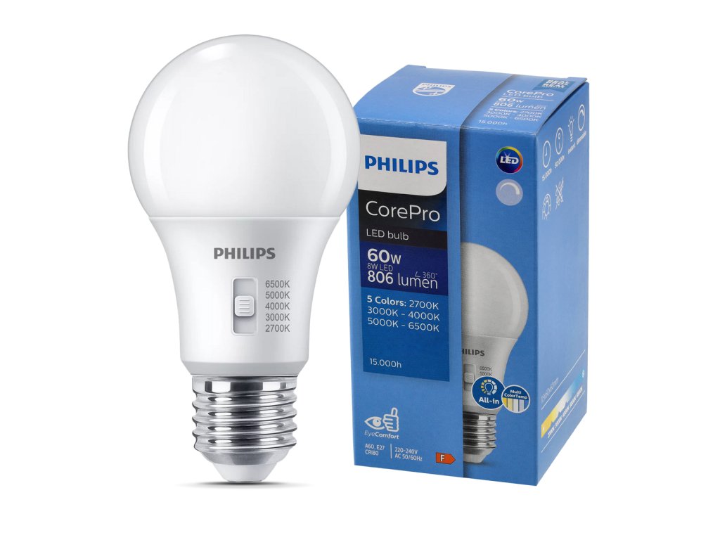 LED žárovka E27 stmívatelná 8W 806lm A60 5CCT Philips 2700K - 6500K