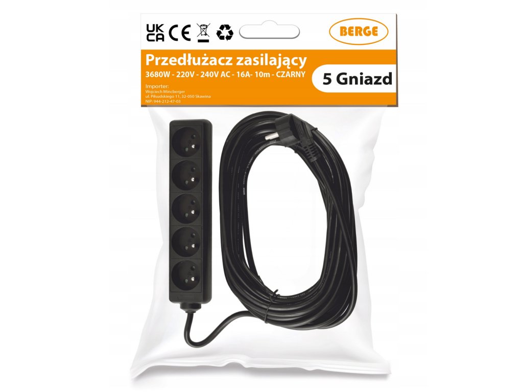 Prodlužovací kabel 10m s uzemněním, 5 zásuvek - černý 3*1,5 mm2 16A 3680W