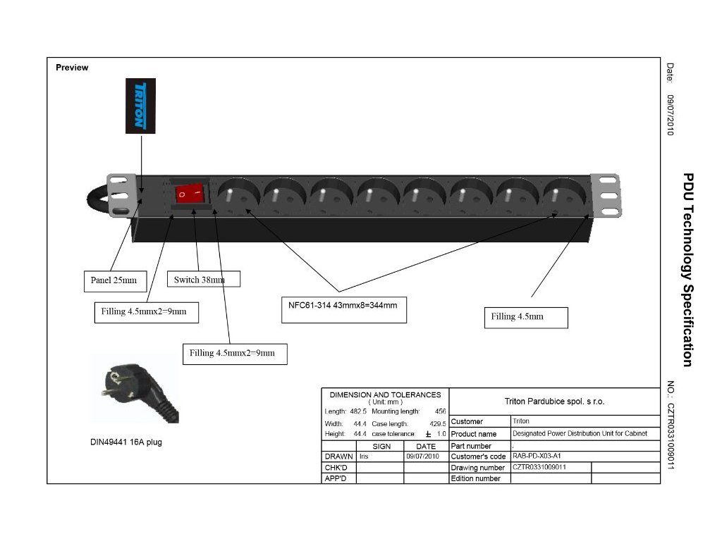 Rozvodný panel Triton 19" 1U 8x 220V-2m včetně vaničky s vypínačem