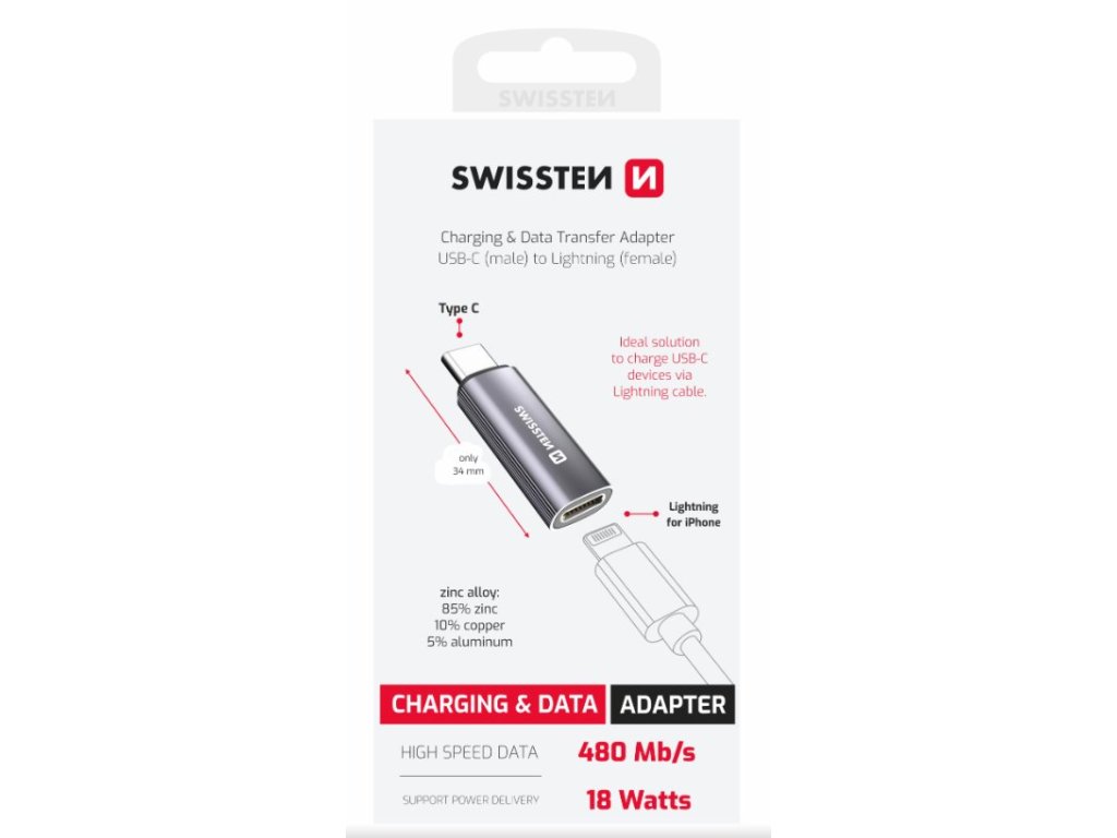 SWISSTEN NABÍJECÍ ADAPTÉR TEXTILE USB-C (samec) / LIGHTNING (samice) STŘÍBRNÝ