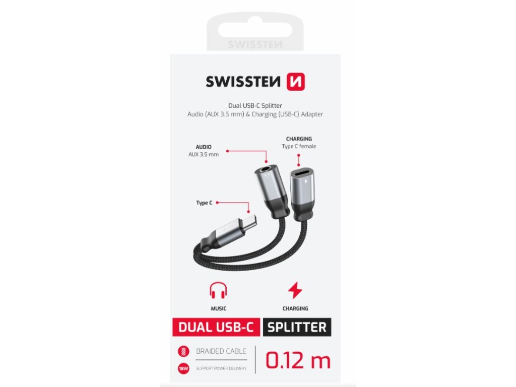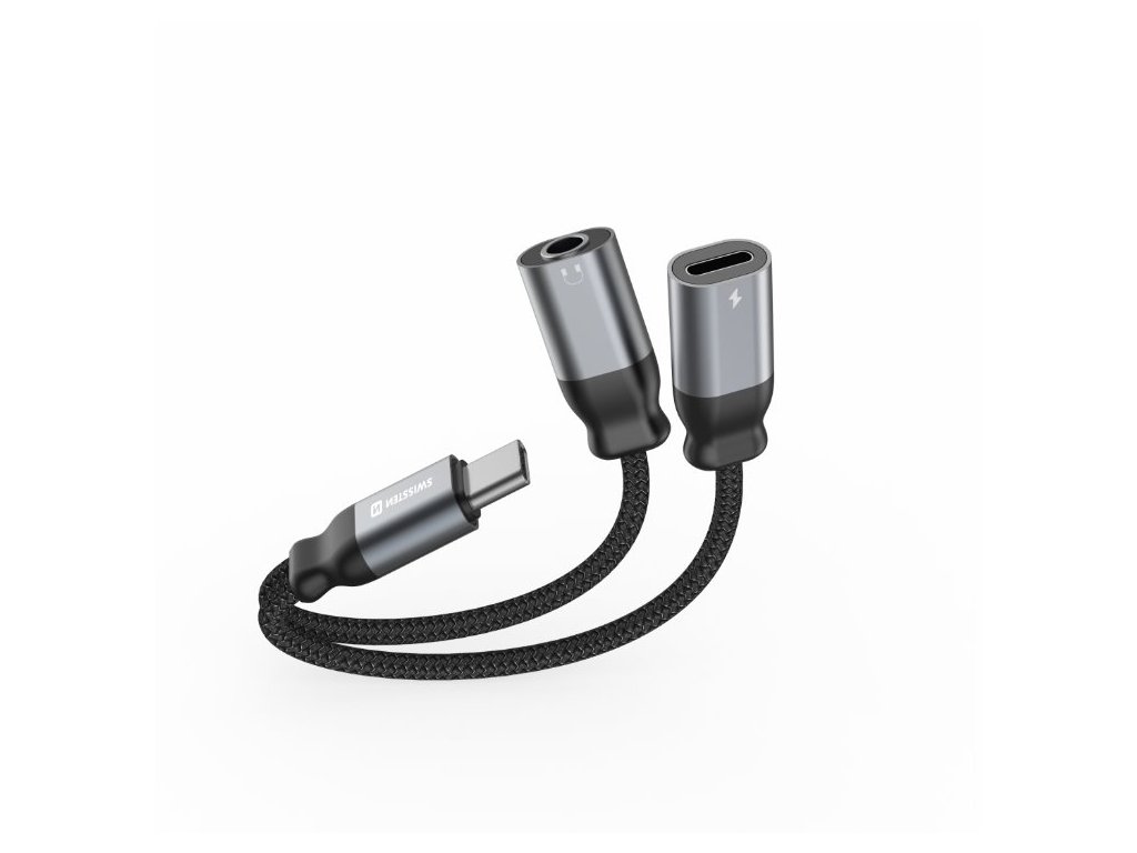 SWISSTEN NABÍJECÍ AUDIO ADAPTÉR TEXTILE USB-C (samec) / USB-C (samice) a 3,5mm AUX 0,12 M ČERNÝ