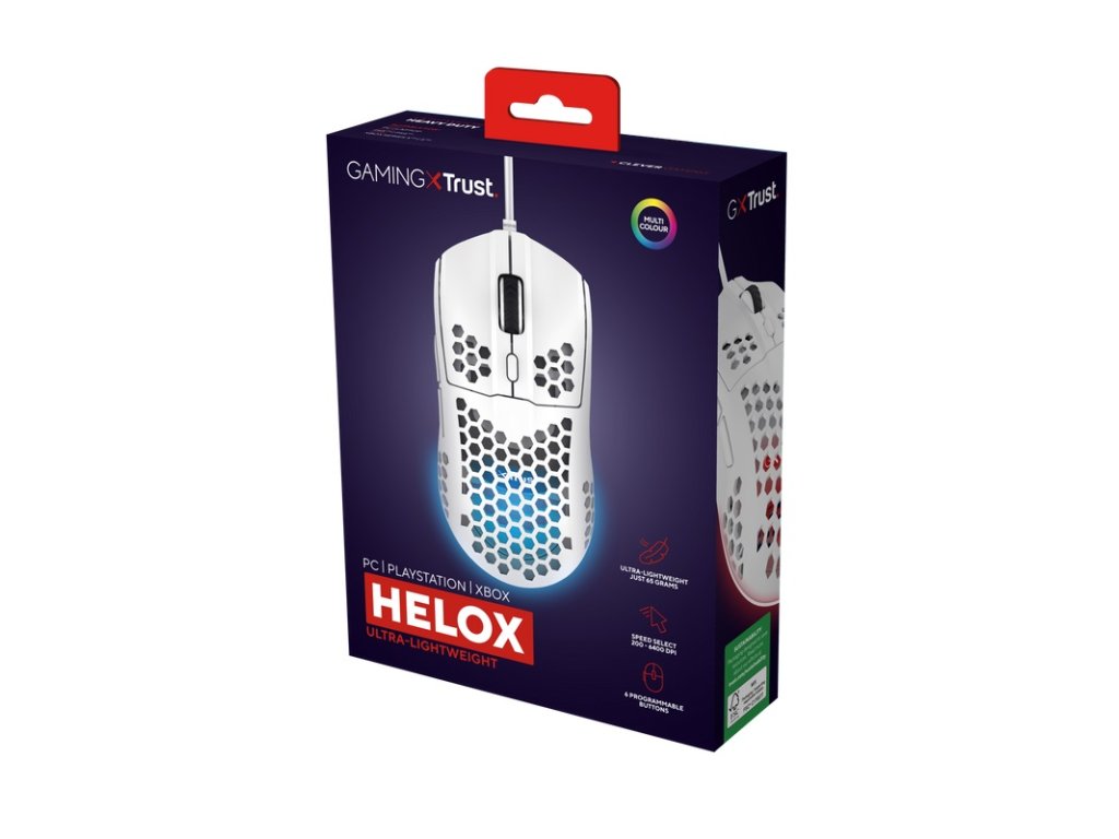 Trust Gaming GXT 928W Helox/Herní/Optická/Pro praváky/6 400 DPI/Drátová USB/Bílá