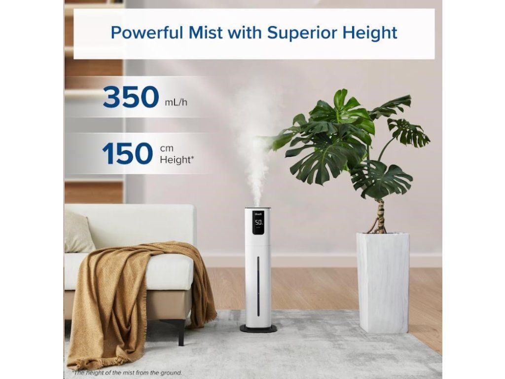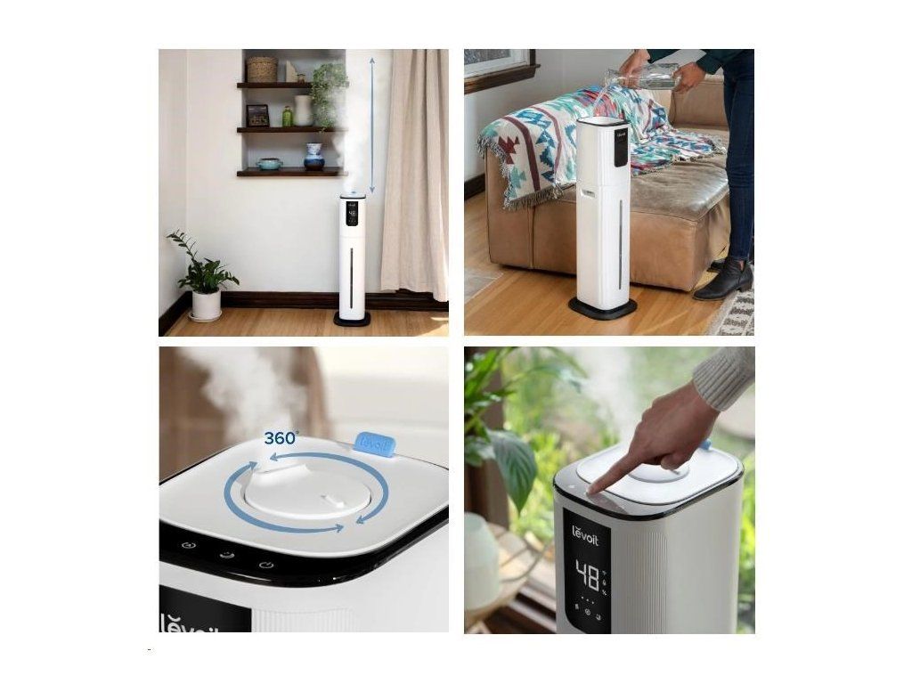 Zvlhčovač Levoit OasisMist Smart je vysoký 72 cm a pára je distribuovaná 360° rotující parní tryskou až do výšky 150 cm. Právě věžovitý design a distribuce páry do výšky zaručí dokonalé zvlhčení vzduchu v místnosti. U menších zvlhčovačů pára padá na podlahu příliš rychle, kde se vysráží na vodu a je nutné je vždy postavit na vyvýšené plochy, což často nevypadá dobře. Design LEVOIT OASIMIST oceníte i jako volně stojící doplněk interiéru.
