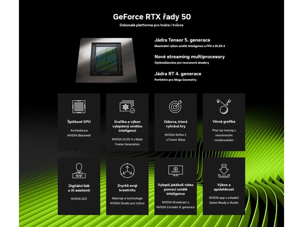 - tenzorová jádra 5. generace - maximální výkon AI s FP4 a DLSS 4