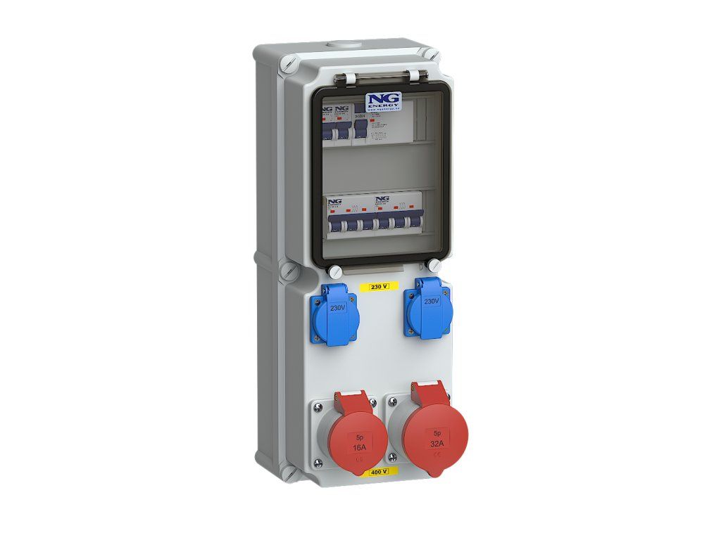 Zásuvky: 1x 32A/400V/5p, 1x 16A/400V/5p, 2x 230V s ochr. kolíkem (česká), Jištění: 2x 16A/1P/B 10 kA, 1x 16A/3P/C 10 kA, 1x 32A/3P/C 10 kA, Proudový chránič: 1x 40A/4P/30mA 10kA, V souladu s normou: ČSN EN 61439-3, Stupeň ochrany krytem: IP44, Jmenovitý proud: 40A, Jmenovité napětí: 400V, Teplotní rozsah použití: -25°C +40°C, Provedení: Nástěnné, Použití: Nástěnné, Pouzdro typ: BALS 6129, Materiál pouzdra: Polykarbonát, Materiál okénka: Polykarbonát, Počet okének: 1, Počet modulů pro přístroje: 16 (2x8) modulů, Barva pouzdra: šedá, Vývodka: 1x MV-32 IP68 (předvrtaný otvor uzavřen záslepkou, vývodka součást balení), Logistické údaje: EAN: 8595169551897, Hmotnost: 4,72 kg, Rozměry použitého pouzdra: 460x180x171. Standardní řada zásuvkových kombinací v polykarbonátových pouzdrech, určená i pro náročné prostředí dílen a staveb. Výběr pouzder nabízí dostatečnou variabilitu i pro náročnější sestavy. Lze vytvářet i přenosné varianty s madlem, s přívodkou či přívodním kabelem. Stejně jako v jiných řadách NG ENERGY je i zde součástí bezpečné a přehledné instalace dvojitá smyčkovací svorkovnice (s výjimkou ekonomických variant). UV-odolný materiál, bezšroubové zásuvky Bals a snadné připojení i smyčkování tvoří základ vedoucí pozice na trhu běžných zásuvkových kombinací. KLÍČOVÉ VLASTNOSTI: pouzdro z vysoce kvalitního, nárazuvzdorného a UV stabilního polykarbonátu, odolné vůči stárnutí, extrémním teplotám, vysoká chemická odolnost, bezhalogenní, samozhášivé, uzamykatelné a plombovatelné kryty přístrojů, přehledné prodrátování, volitelně dvojitá připojovací svorkovnice, volitelně vnější zemnící bod, celkové krytí až IP65. Na základě vašich individuálních požadavků je možné vytvořit jakoukoliv konfiguraci!Kód produktu: 11.232.455