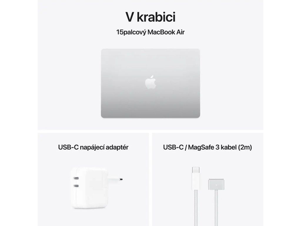 Obsah balení: MacBook Air, napájecí adaptér, USB-C/MagSafe 3 kabel, návod