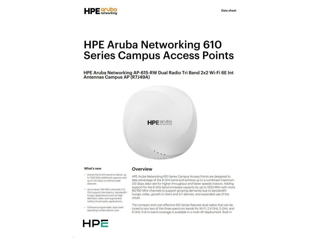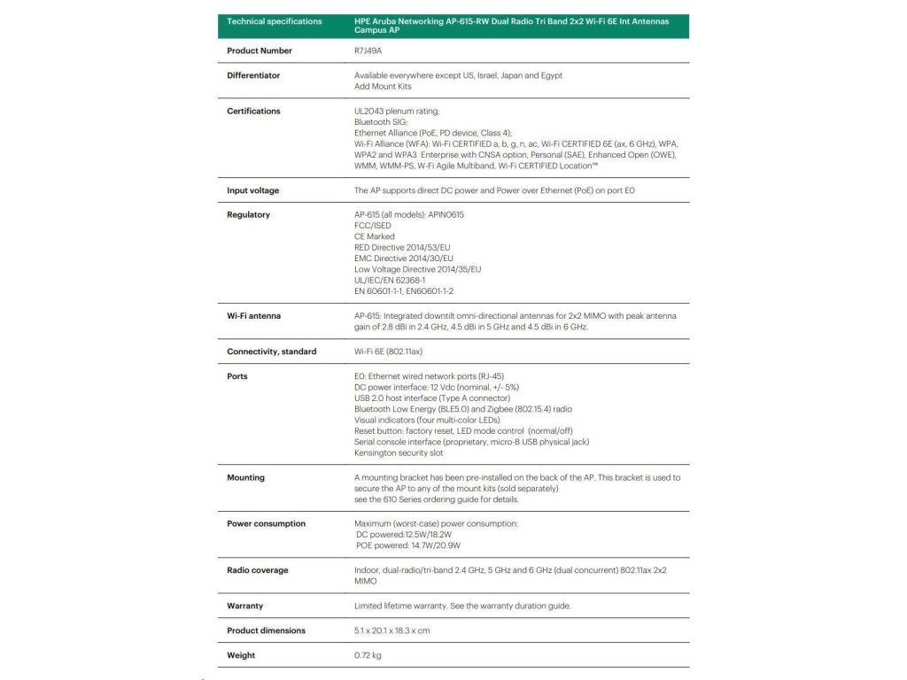 Aruba AP-615 (RW) Dual-radio Tri-band 2x2:2 802.11ax Wi-Fi 6E Internal Antennas Campus AP