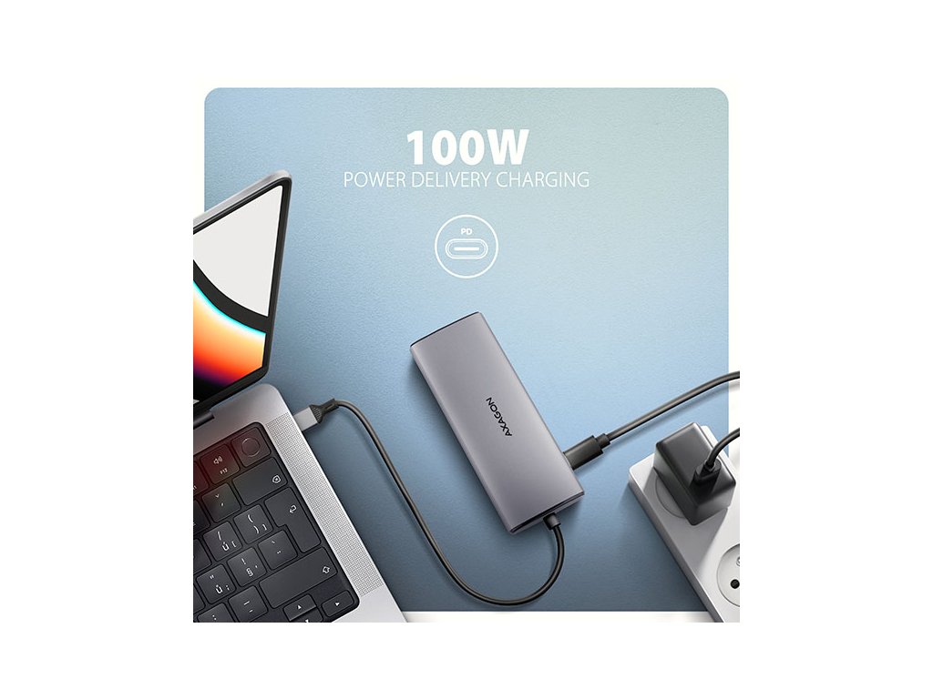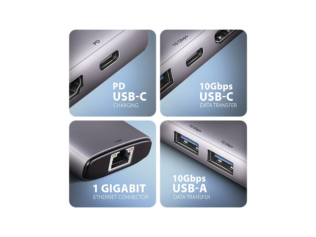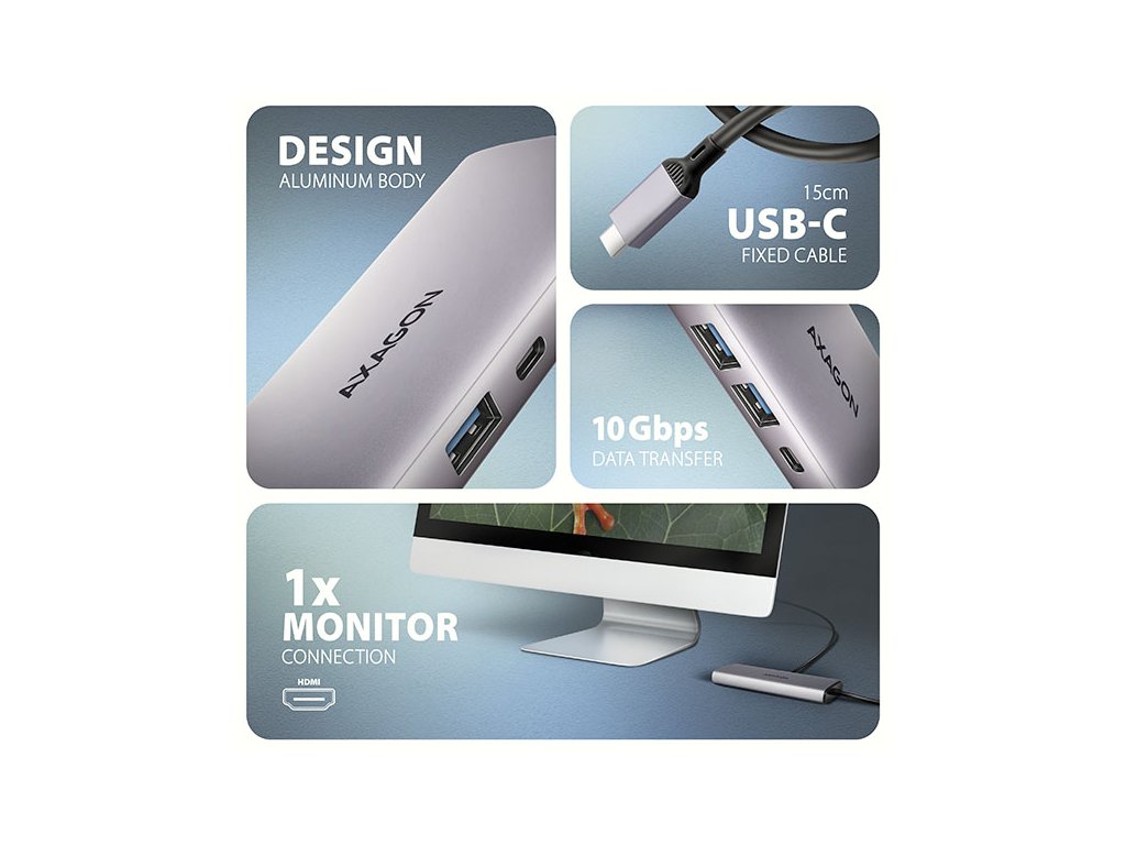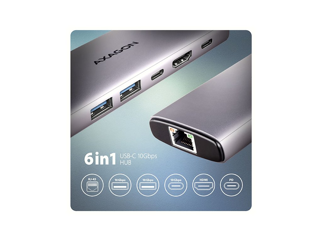AXAGON HMC-6G2L, USB 10Gb/s hub, 2x USB-A, 1x USB-C, HDMI 4k/60, RJ-45, PD 100W, kabel USB-C 15cm